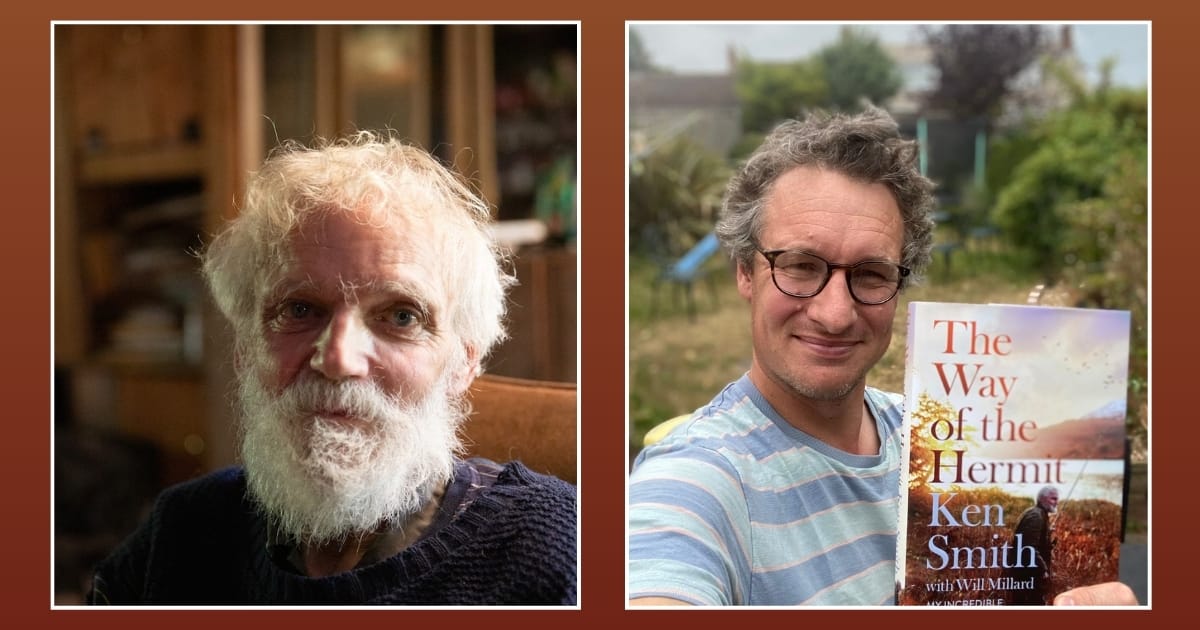 Hermit and author Ken Smith. Co-author Will Millard holds a copy of the UK edition of the book.
