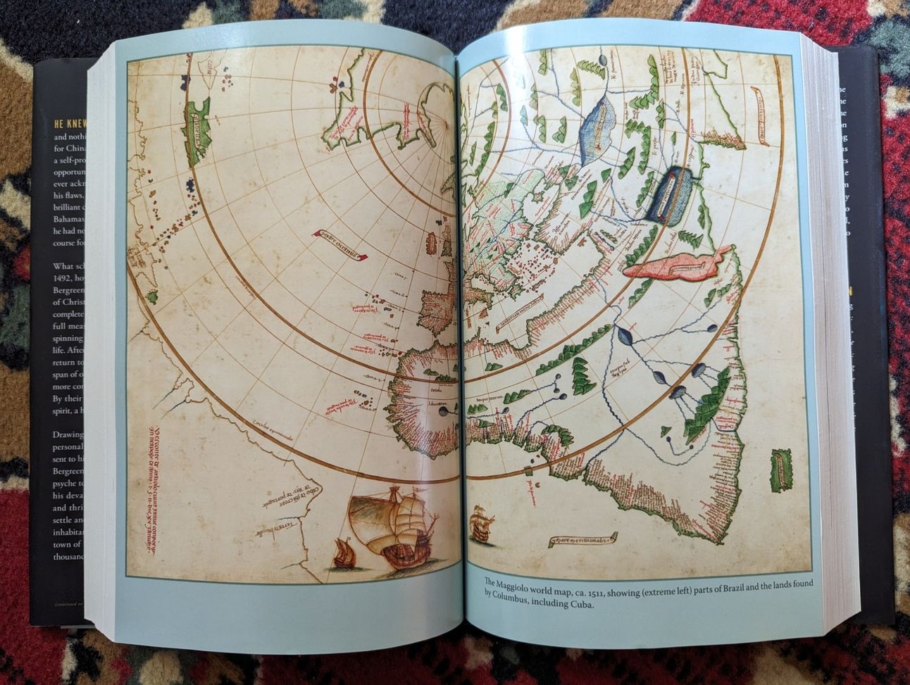 One of many plates in the book, this is the Maggiolo world map from about 1511 which includes (on the left hand side) parts of Brazil and the islands found by Columbus