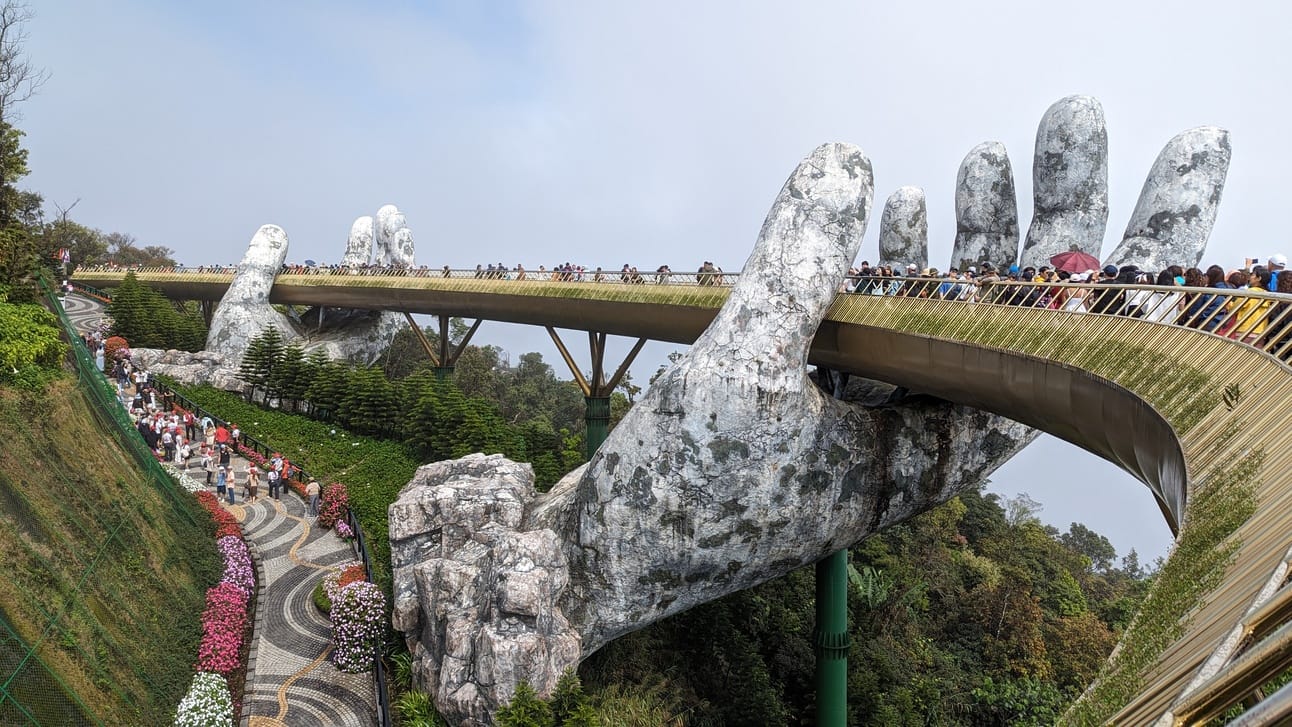 Speaking of happy distractions, here’s a photo of Vietnam’s Golden Bridge. The bridge is set high up on a mountain top and has become known as one of the most “Instagram-able” tourist spots in central Vietnam. The bridge is supported by two large hands rising out of the mountain top. To visit the Bridge we took a day trip from Danang to the Ba Na Hills.