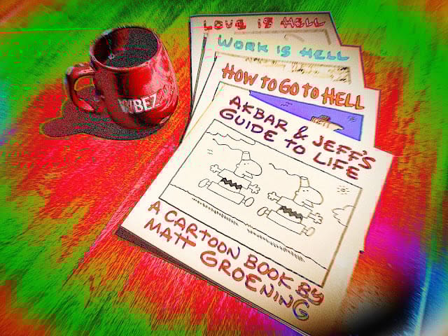 Akbar & Jeff’s Guide to Life – A Cartoon Book by Matt Groening. Published in the United States by Pantheon Books, a division of Random House, Inc., New York, and simultaneously in Canada by Random House of Canada Limited, Toronto. Copyright 1982, 1984, 1986, 1987, 1988, 1989 by Matt Groening. Dedicated “to my son Homer”.