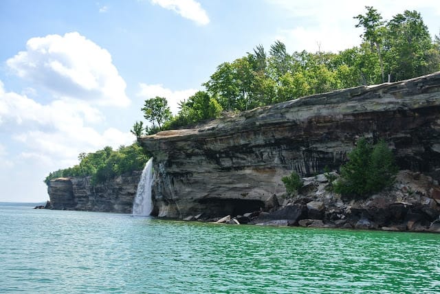 Despite Her Cleanliness, She Has Some Stains – Along the southern shore of Lake Superior east of Munising is the Pictured Rocks National Lakeshore – 15 miles of towering multicolored cliffs which are absolutely beautiful by boat or kayak. The color in the sandstone cliffs is left behind after dripping water deposits iron and other minerals within the sandstone. So even her stains are beautiful.